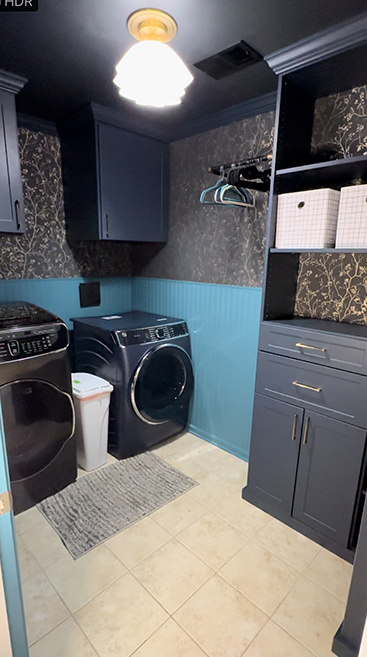 Custom shelves, cabinets, and pull-out hampers to keep your laundry room organized and clutter-free.